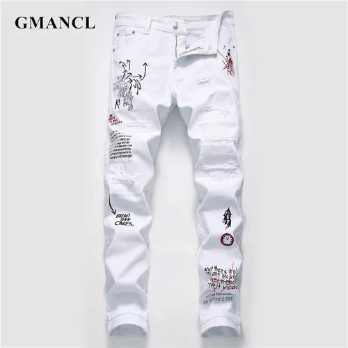 New Men Streetwear personality Ripped printed white skinny Jeans